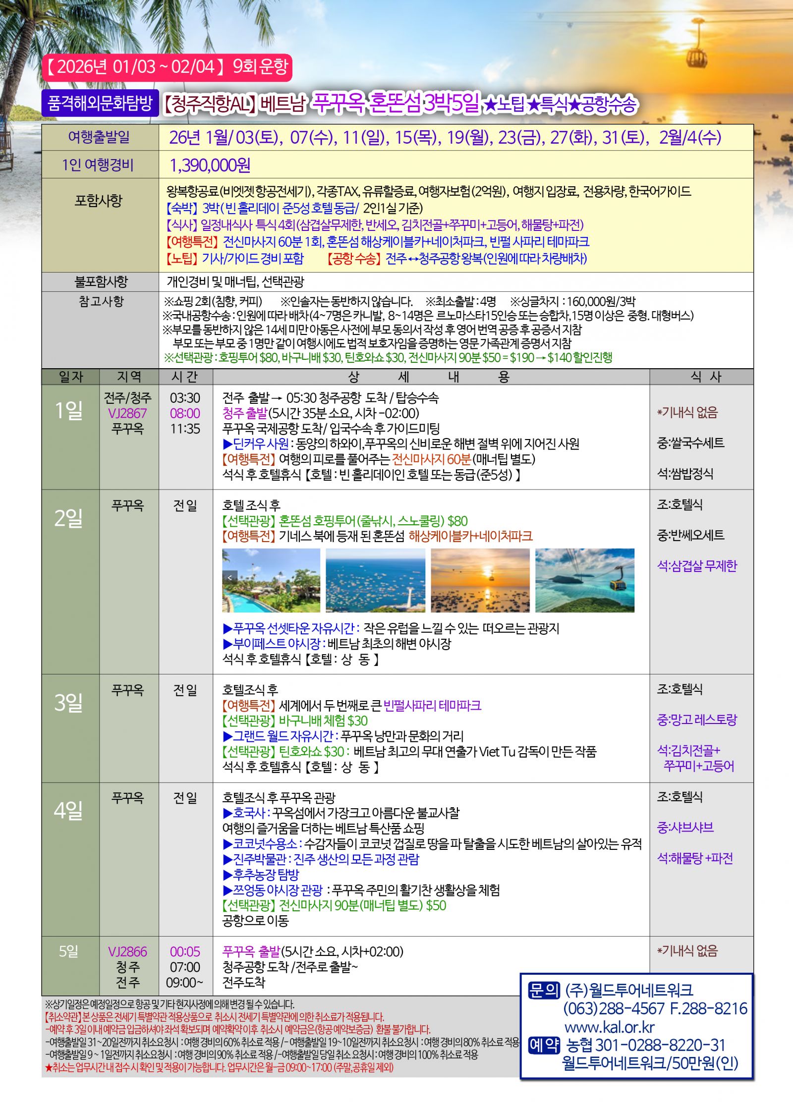 26년 1월~2월【청주↔푸꾸옥AL】 베트남 푸꾸옥 3박5일 (품격★노팁★공항수송)